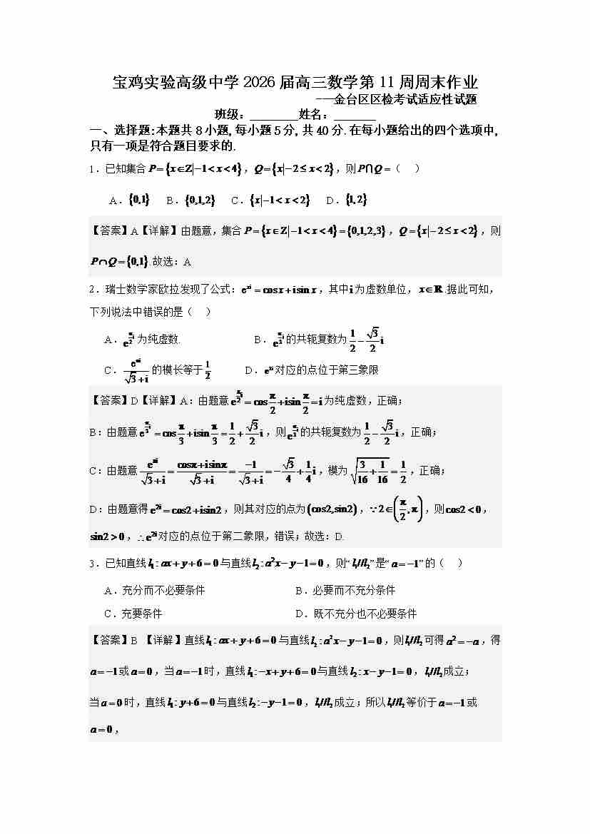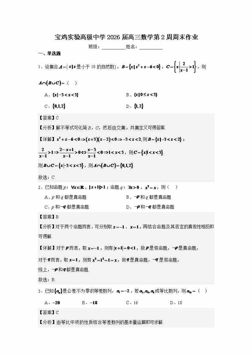 宝鸡实验高级中学2026届高三数学第2周周末作业(教师版)