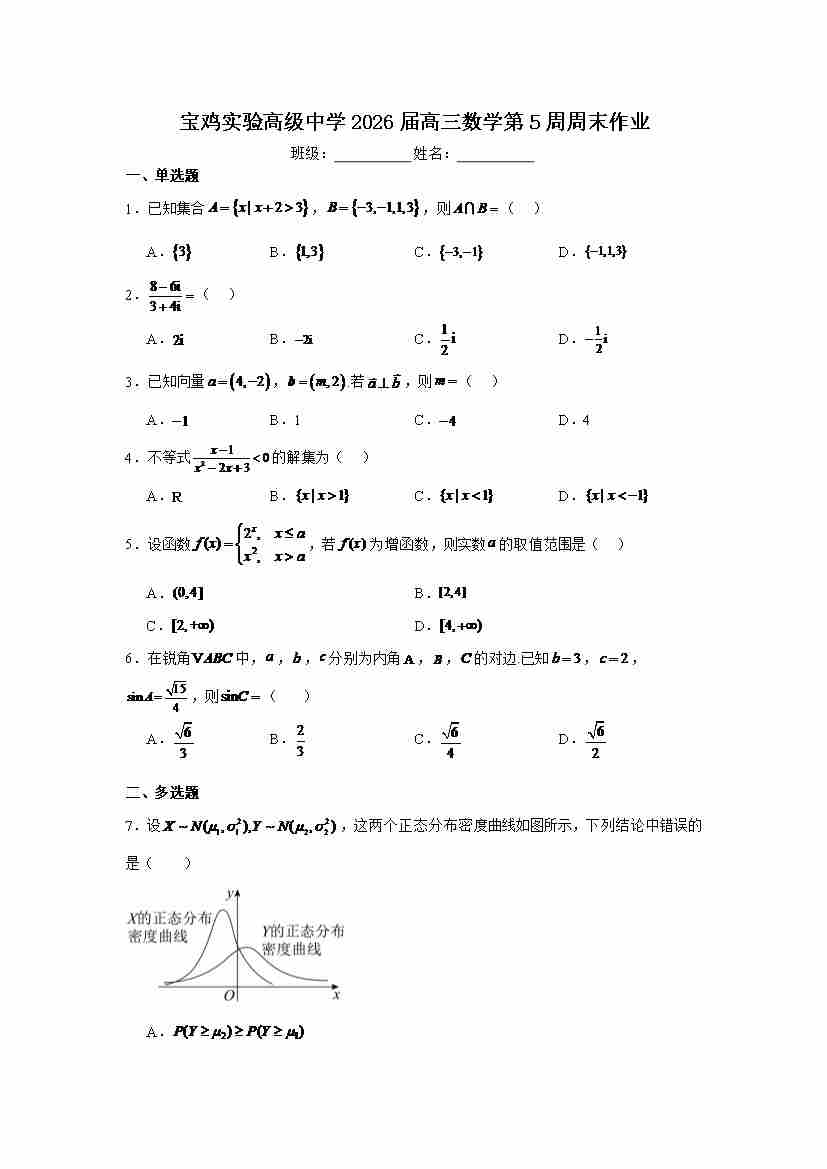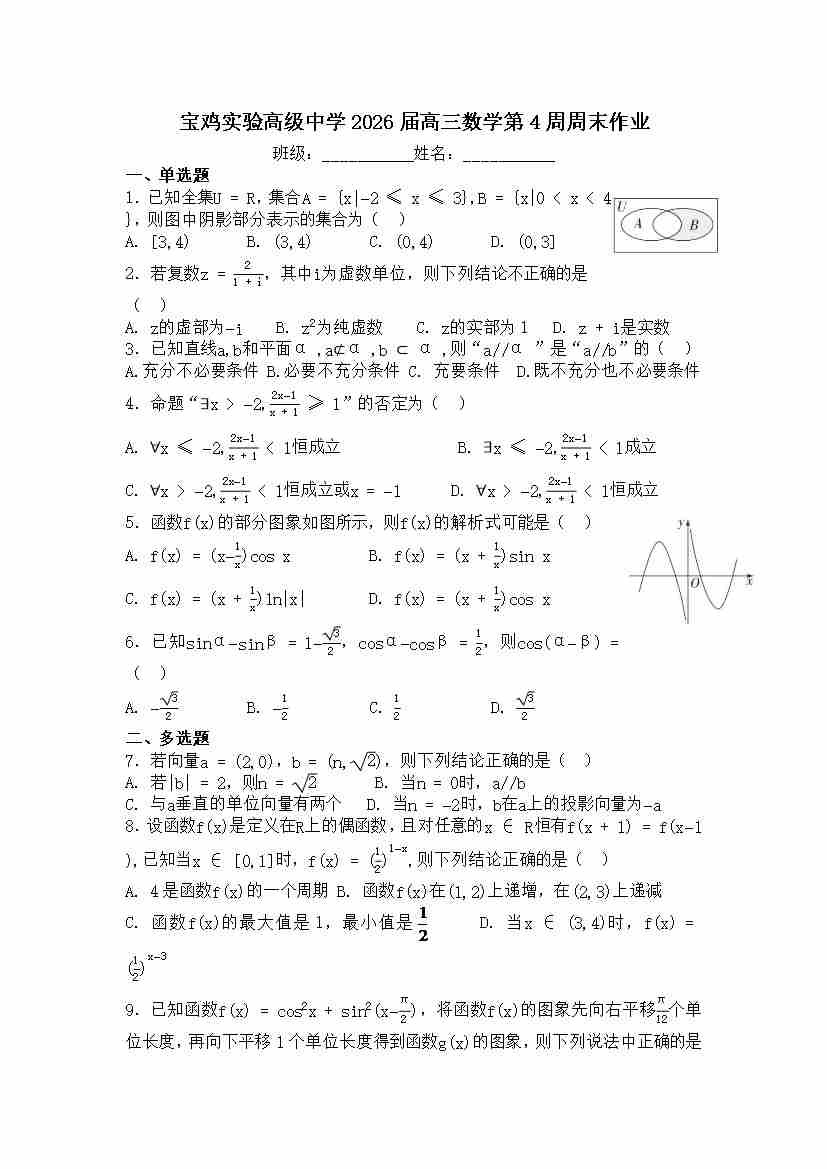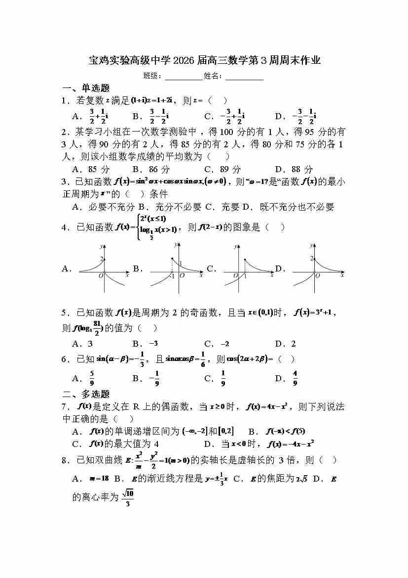 宝鸡实验高级中学2026届高三数学第4周周末作业(学生版)