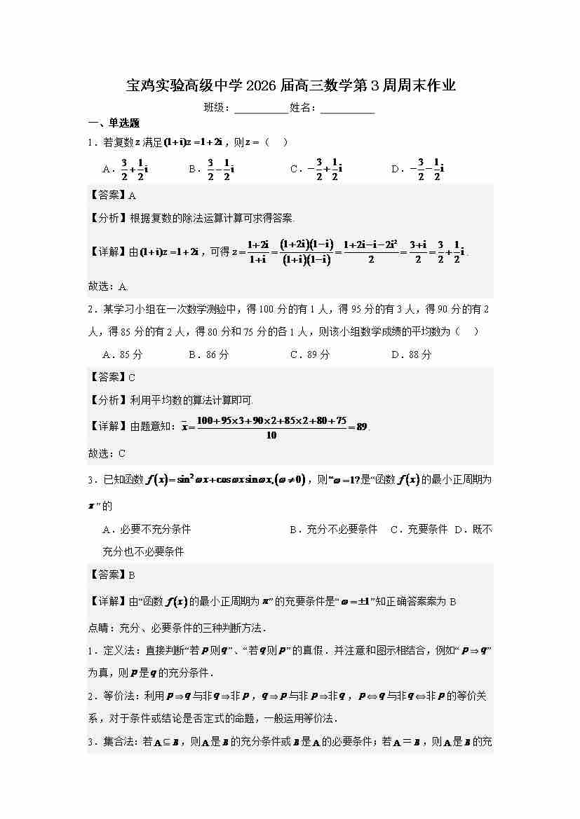 宝鸡实验高级中学2026届高三数学第3周周末作业(教师版)