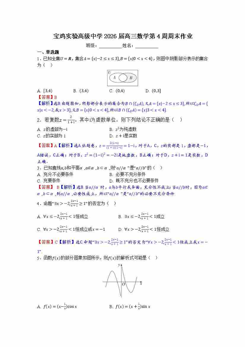 宝鸡实验高级中学2026届高三数学第4周周末作业(教师版)