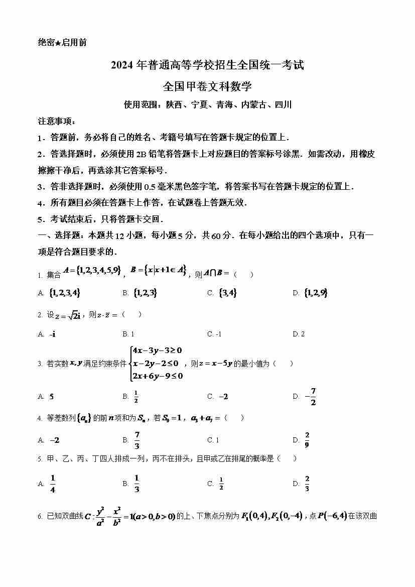 精品解析:2024年高考全国甲卷数学(文)真题(原卷版)
