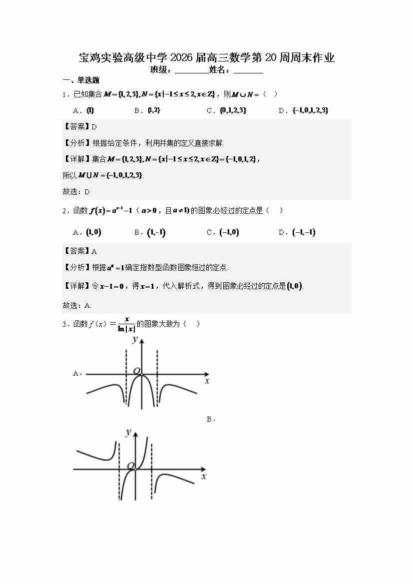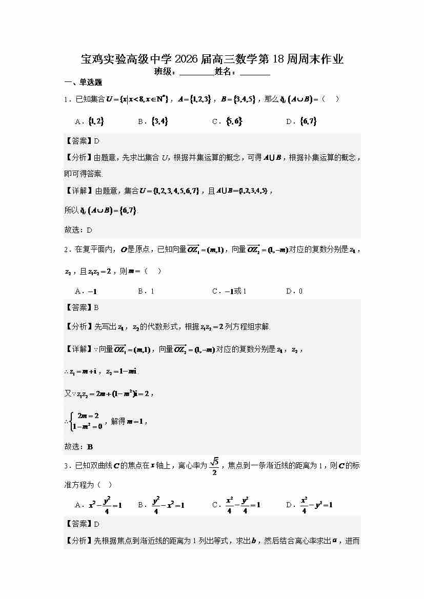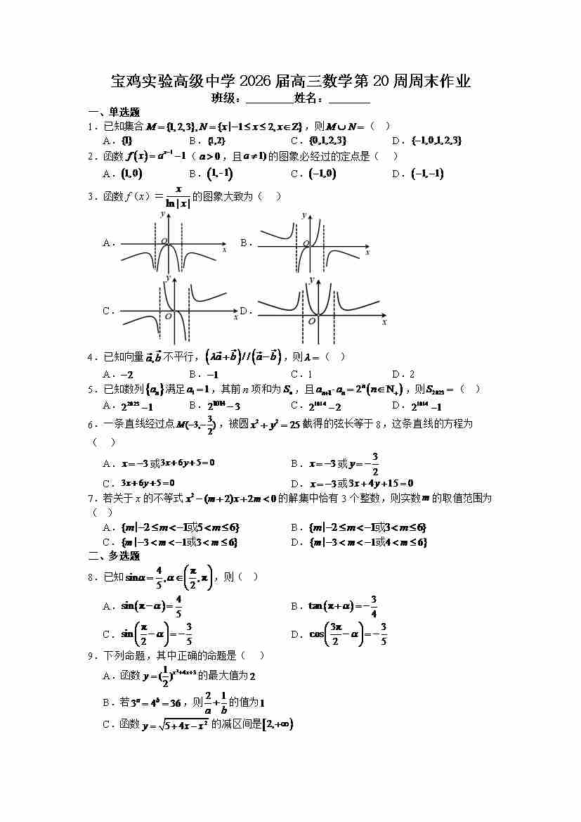 宝鸡实验高级中学高三数学第20周周末作业(学生版)