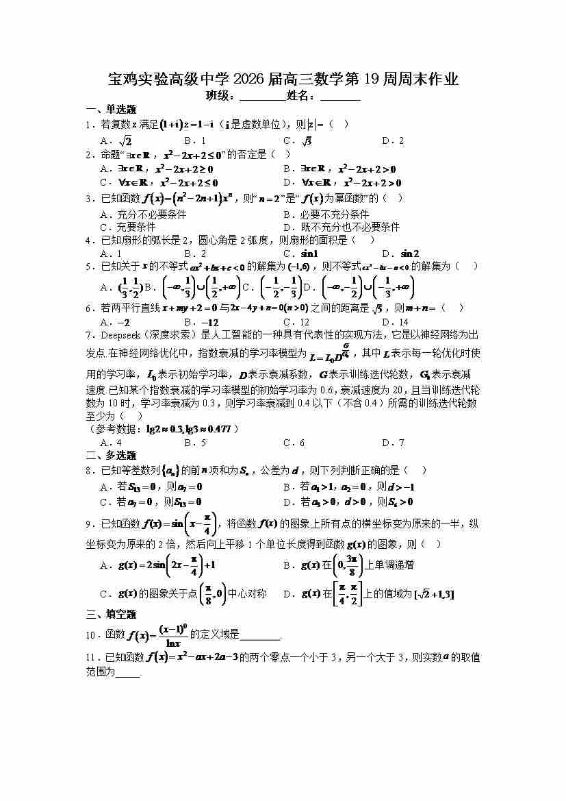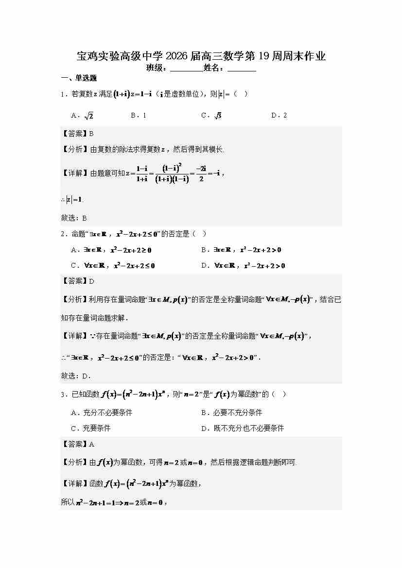 宝鸡实验高级中学高三数学第19周周末作业(学生版)