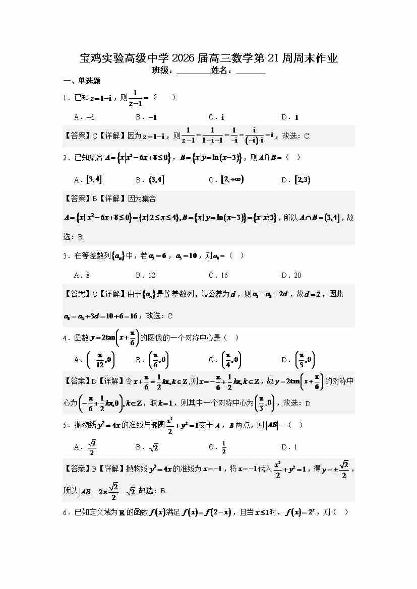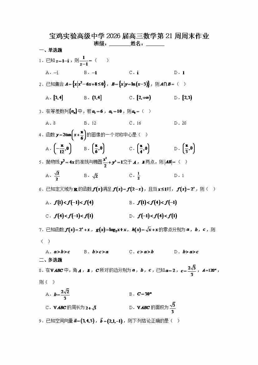 宝鸡实验高级中学高三数学第21周周末作业(学生版)
