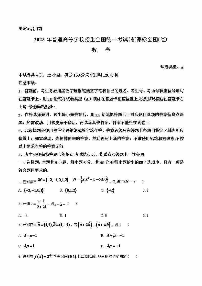 精品解析:2023年新课标全国Ⅰ卷数学真题(原卷版)