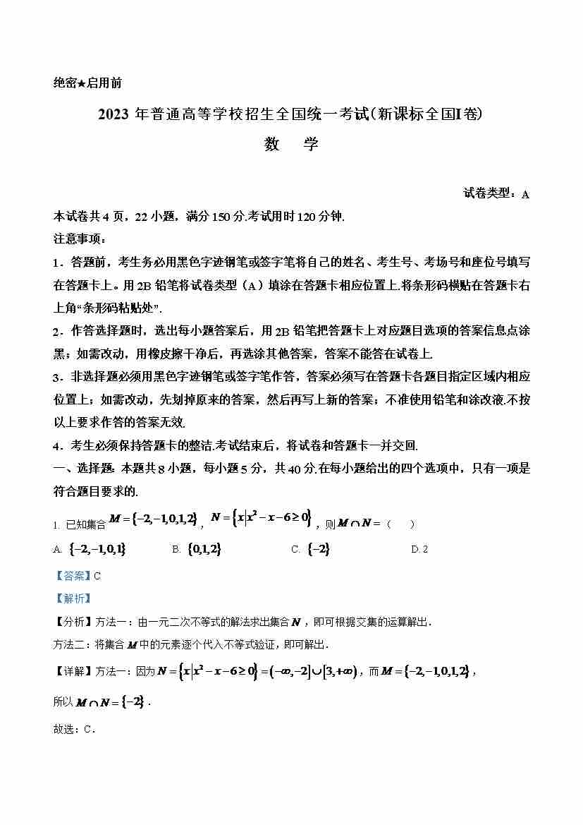 精品解析:2023年新课标全国Ⅰ卷数学真题(解析版)