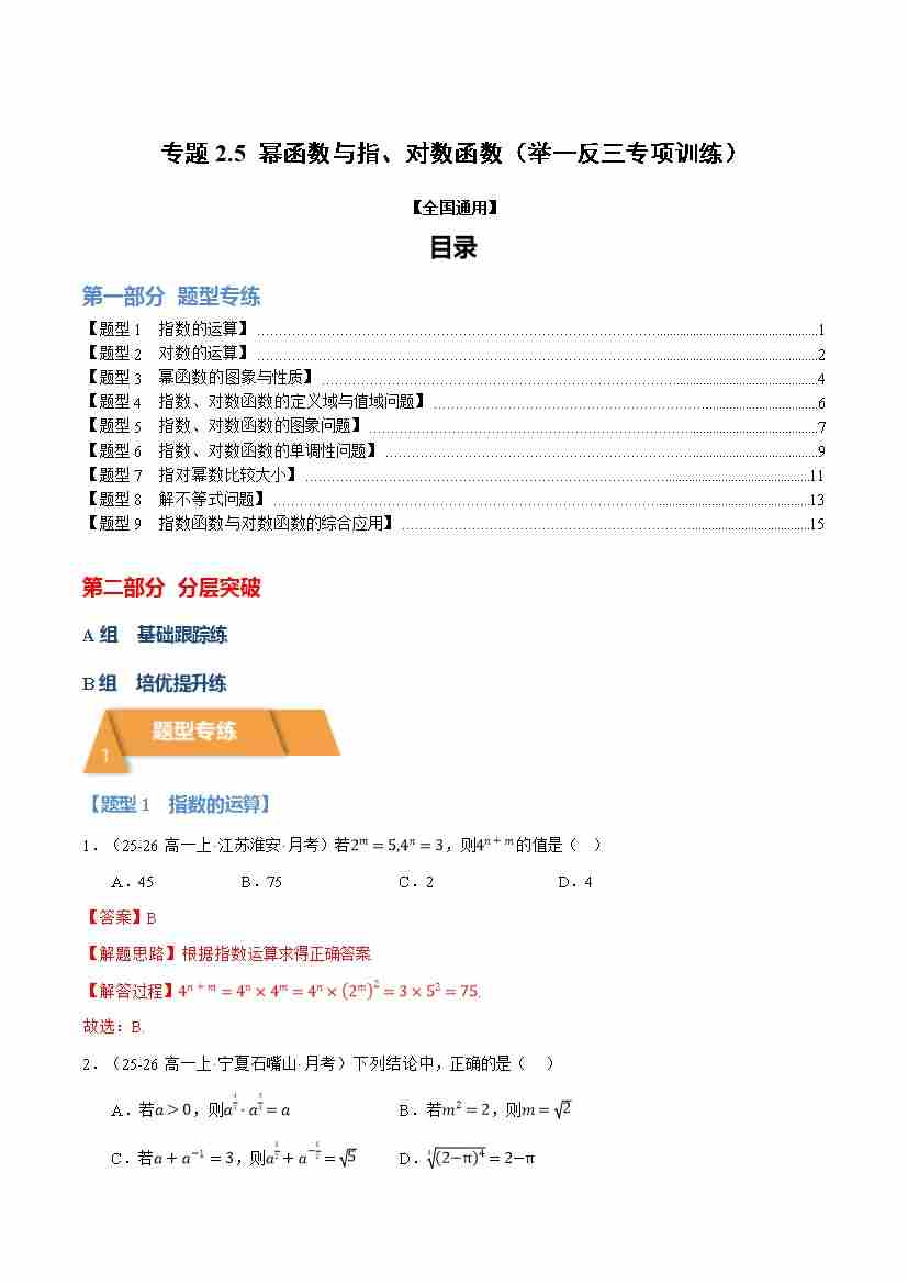 专题2.6 幂函数与指、对数函数(举一反三专项训练)(全国通用)(学生版)