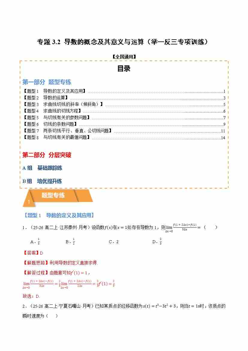 专题3.2 导数的概念及其意义与运算(举一反三专项训练)(全国通用)(学生版)