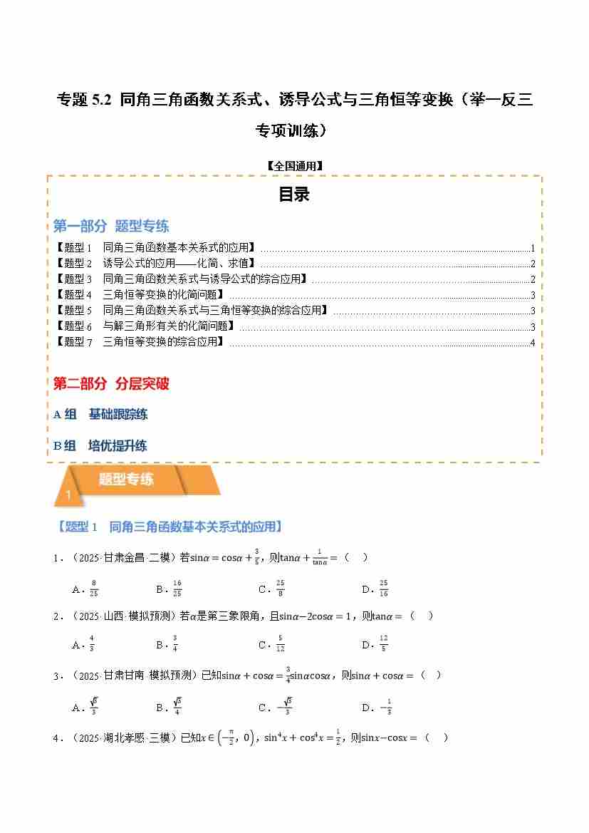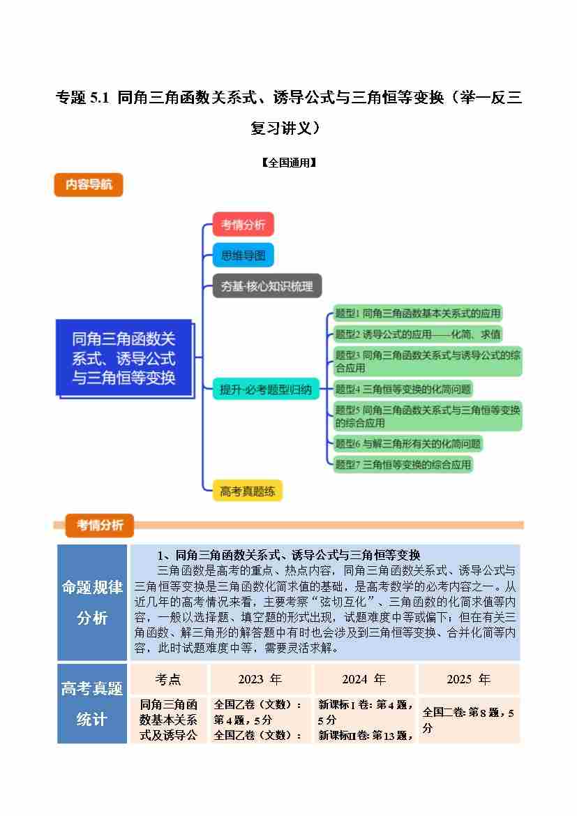 专题5.1 同角三角函数关系式、诱导公式与三角恒等变换(举一反三复习讲义)(全国通用)(试题版)