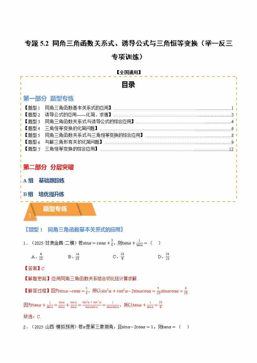 专题5.2 同角三角函数关系式、诱导公式与三角恒等变换(举一反三专项训练)(全国通用)(试题版)