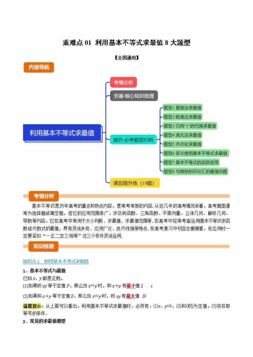 重难点01 利用基本不等式求最值8大题型(举一反三专项训练)(全国通用)(学生版)