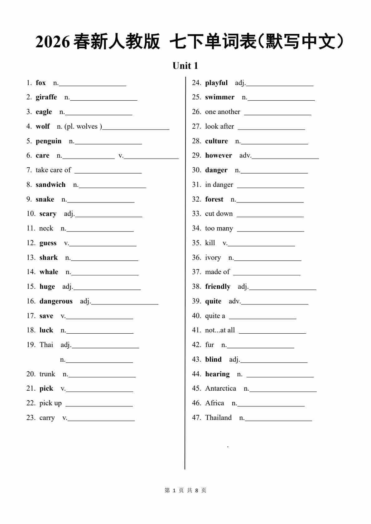 2026新人教版新七下单词表(默写英文)