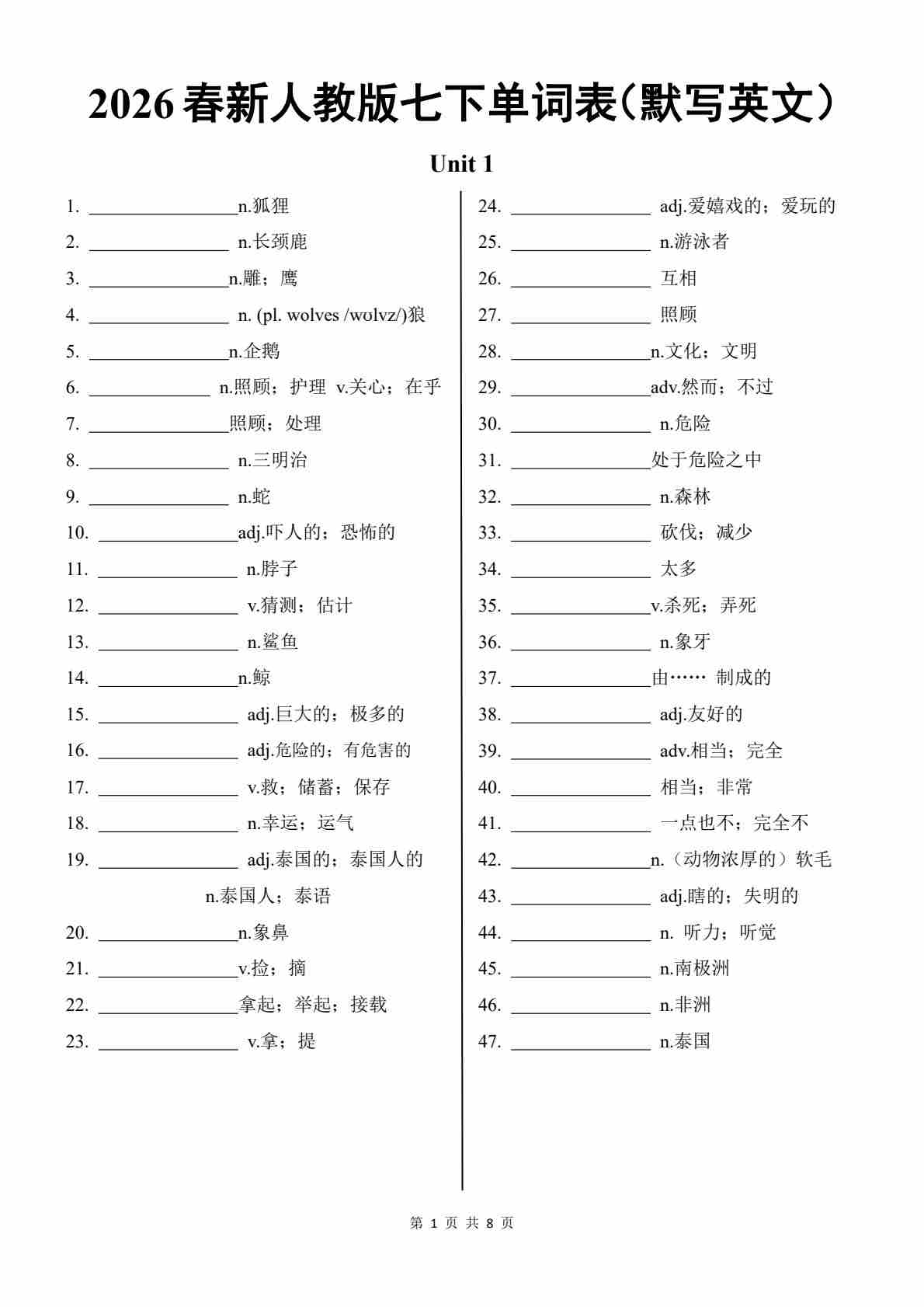 2026新人教版新七下单词表(默写中文)