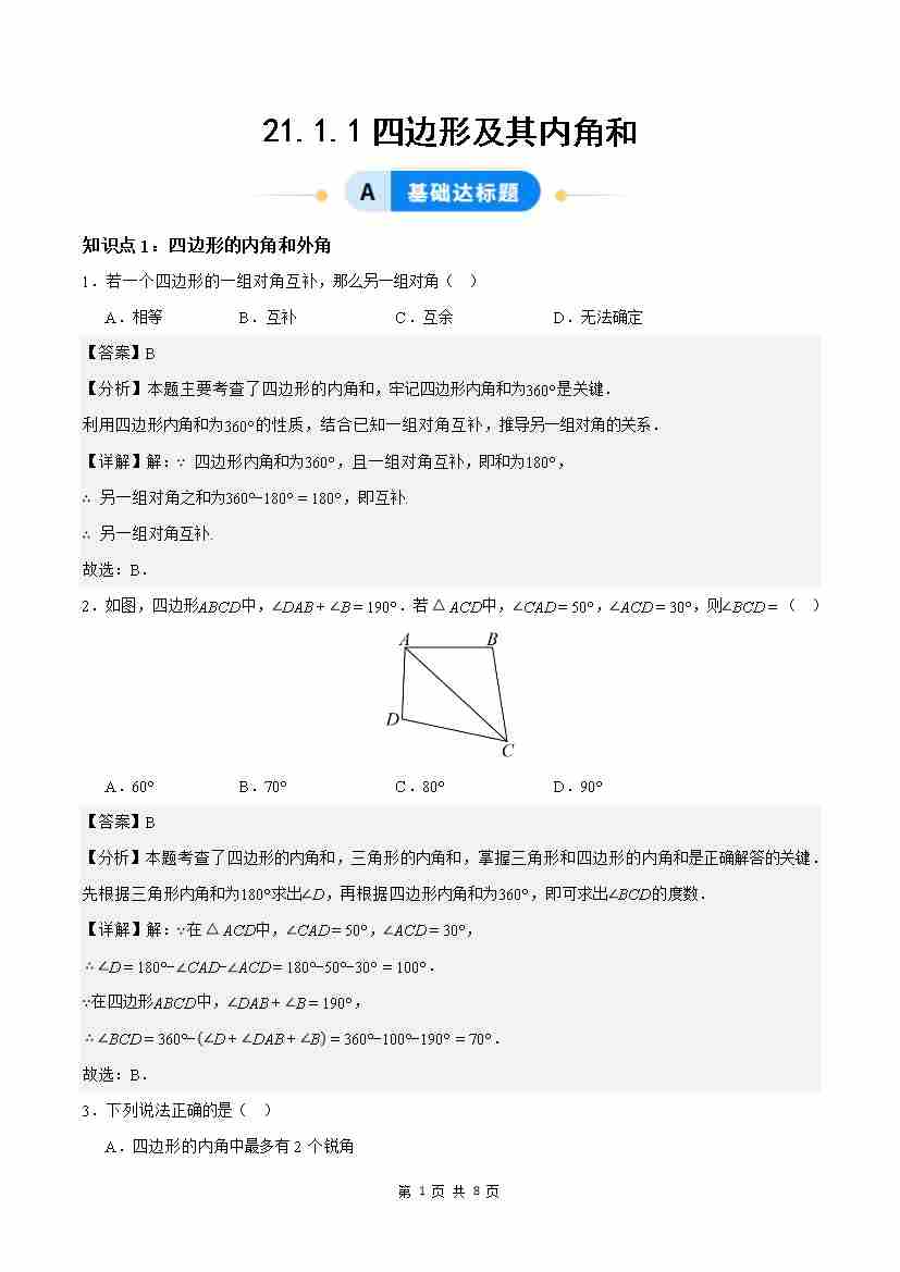 21.1.1四边形及其内角和( 分层作业)【解析版】