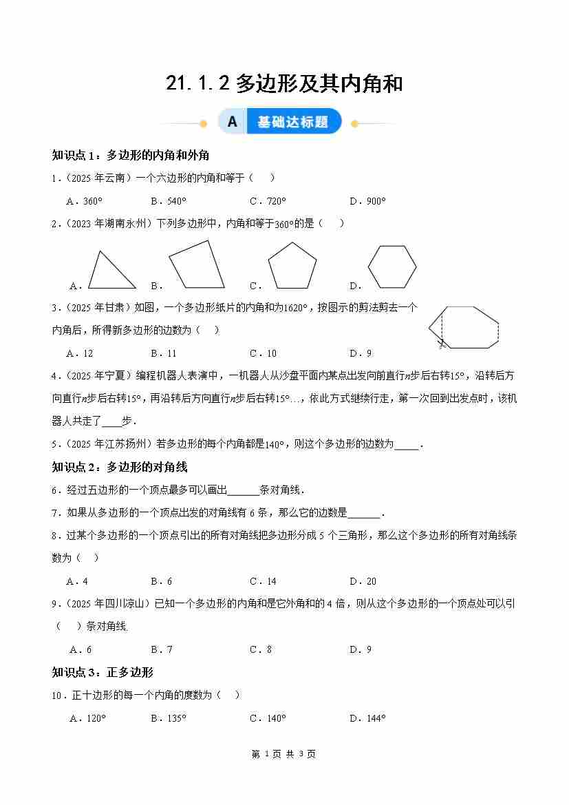 21.1.2多边形及其内角和( 分层作业)【原卷版】