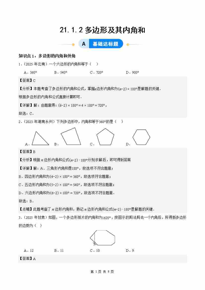 21.1.2多边形及其内角和( 分层作业)【解析版】