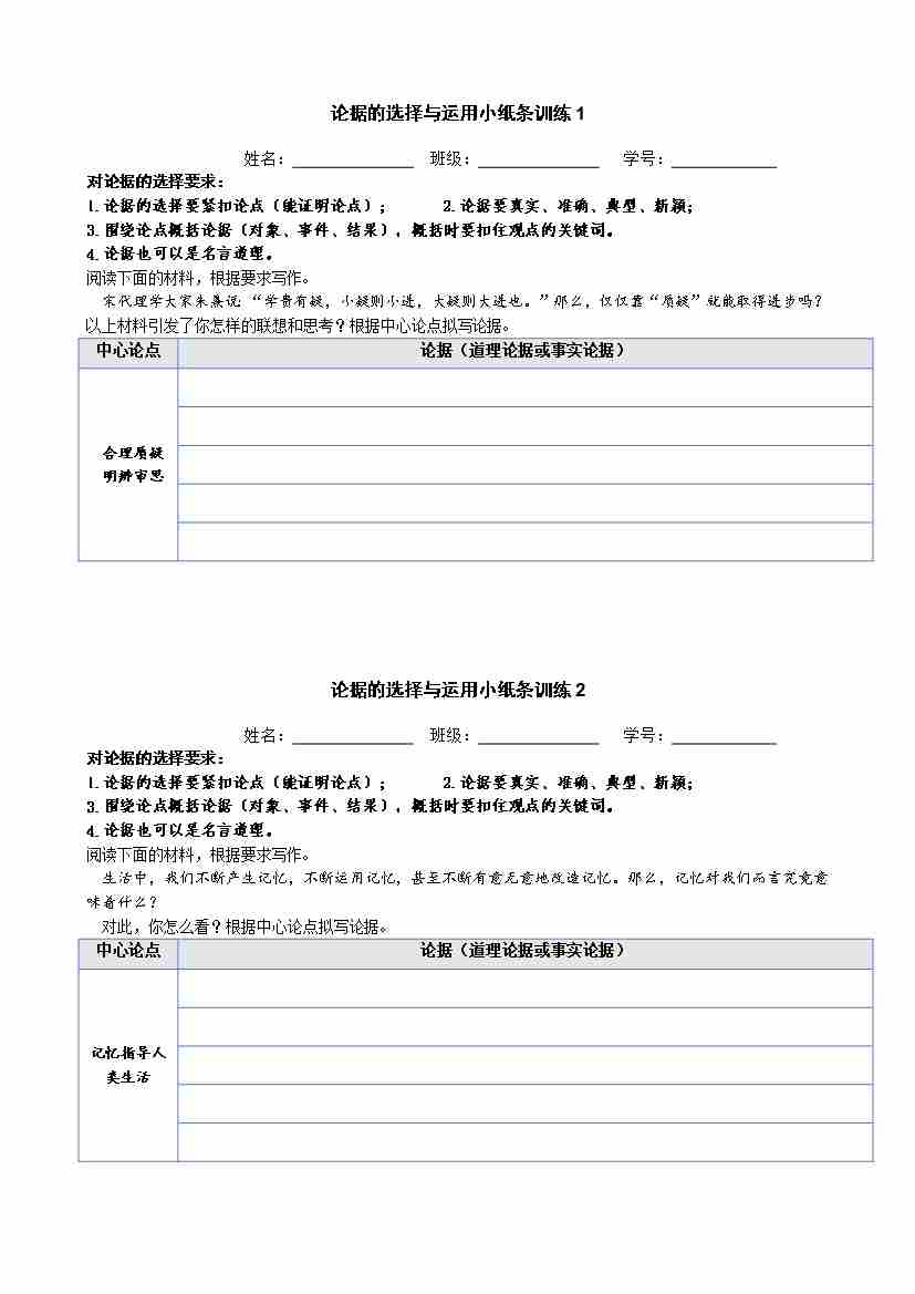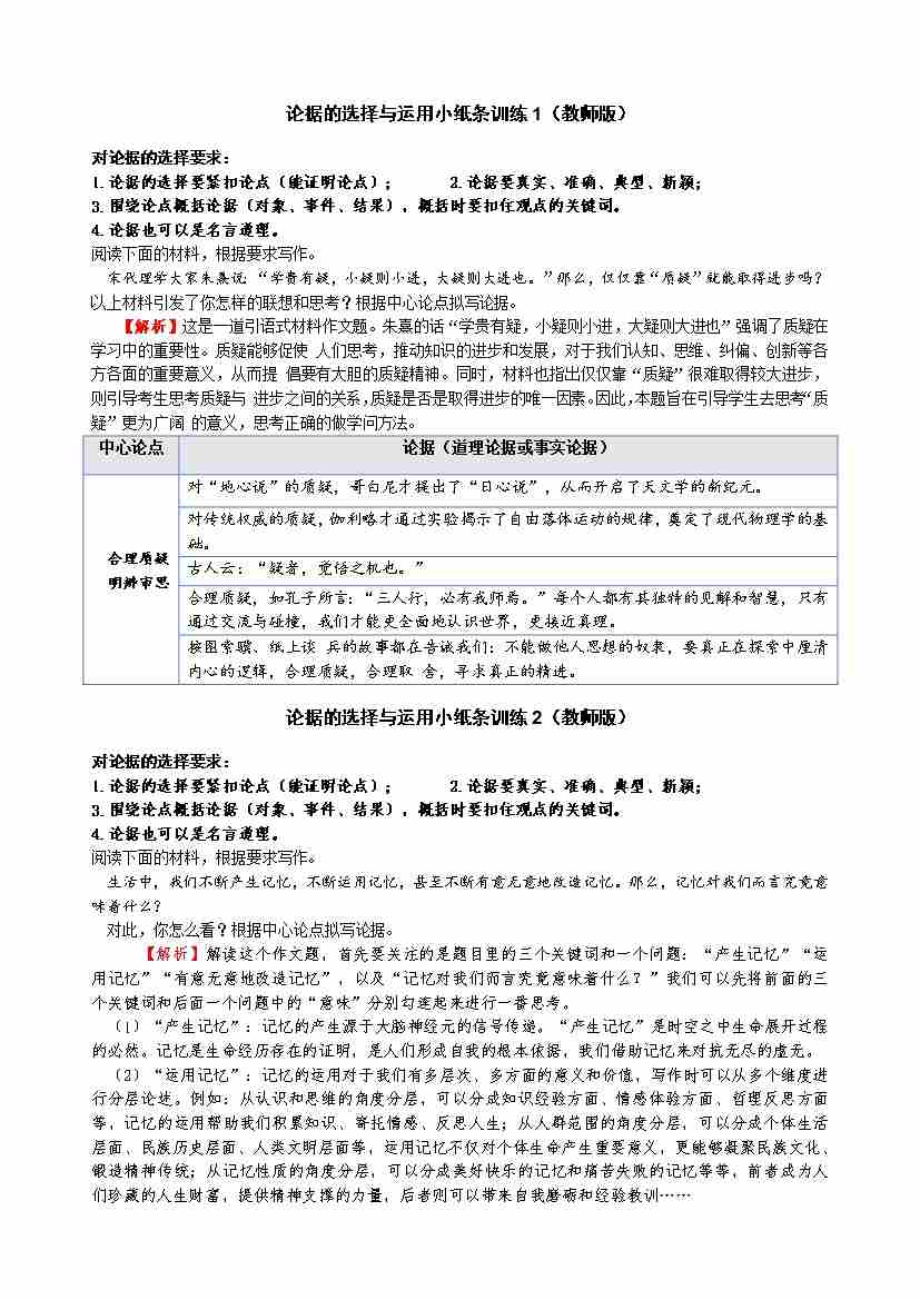 论据的选择与运用小纸条训练1-10(教师版)